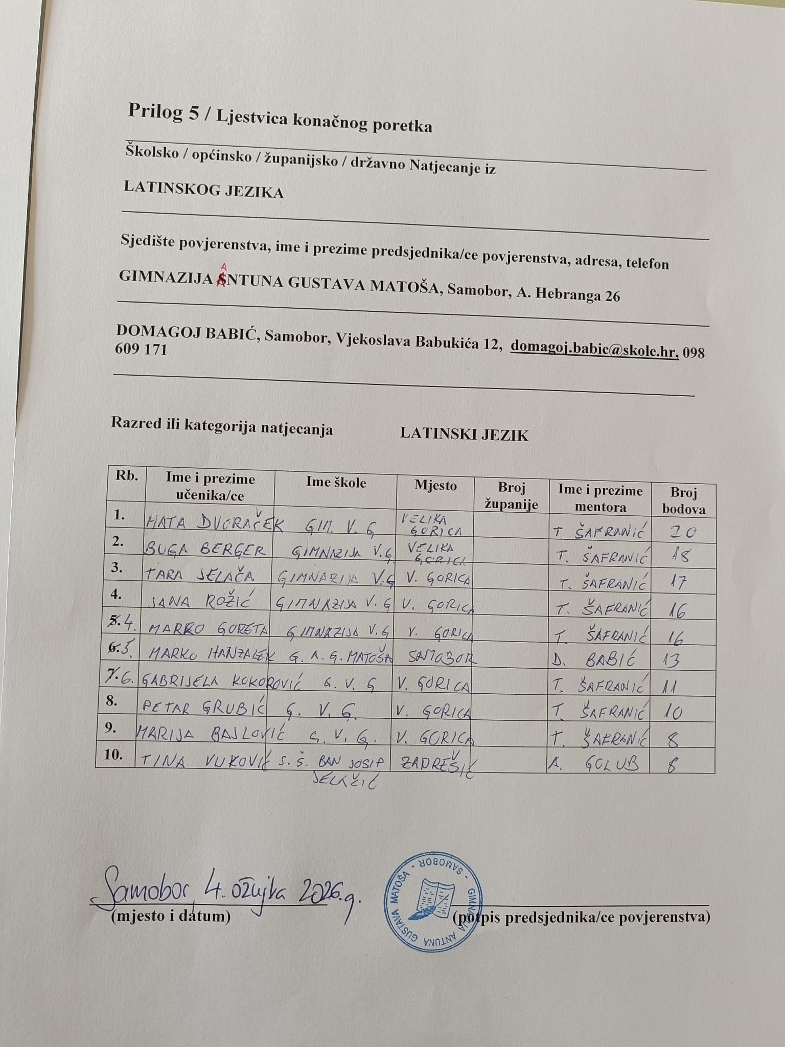 05ožu. 2026 od Nevenka Fresl Nema komentara U nastavku možete pogledati ljestvicu konačnog poretka sa županijske razine Natjecanja iz latinskoga jezika.